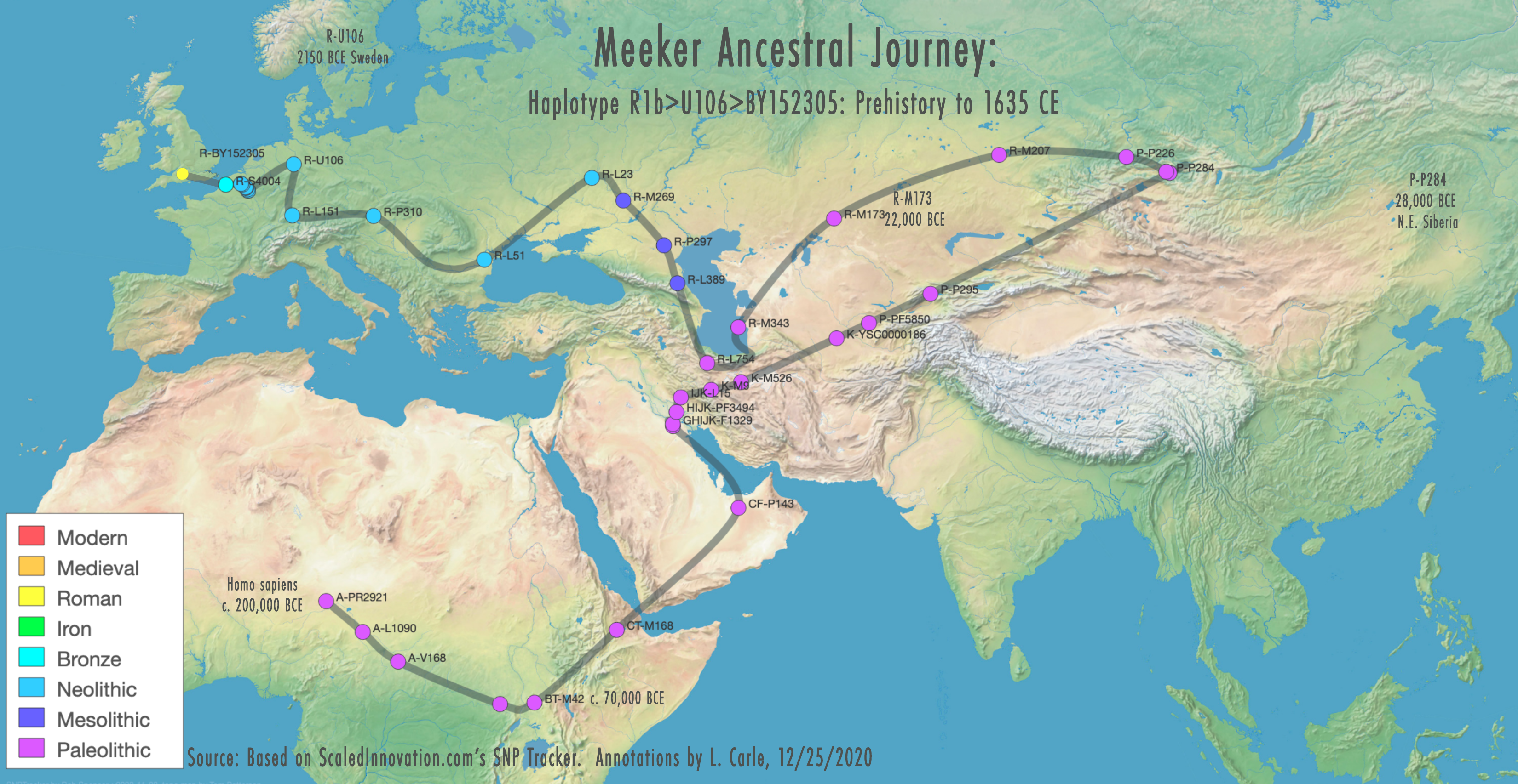 The advent of Y-DNA testing and sequencing of ancient samples of DNA allow us to trace the family’s trajectory from prehistory to the present day as depicted in the image above, but thus far historical records provide evidence of the family’s existence only as of the middle of the 15th century in England.